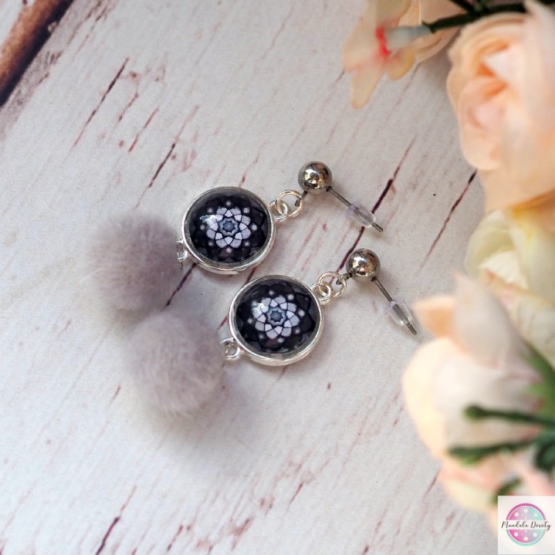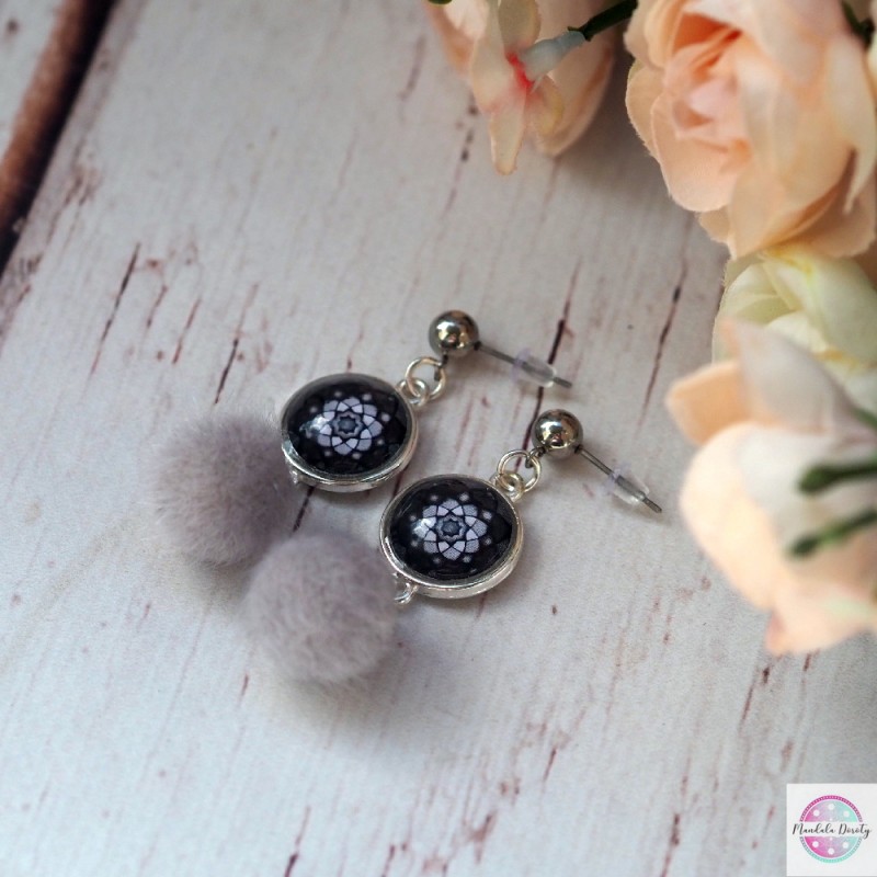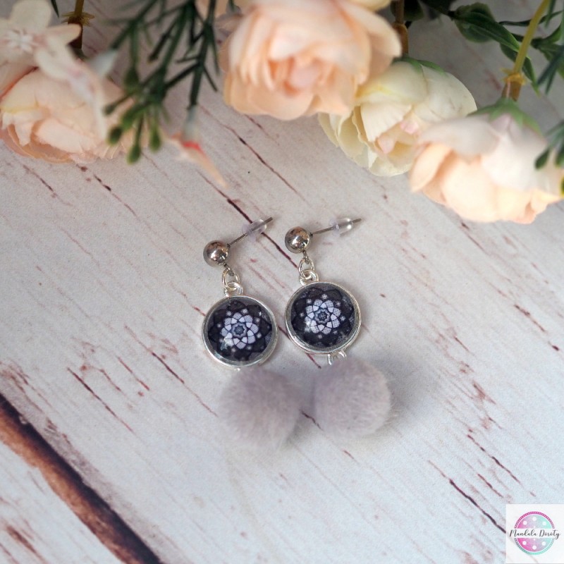 Kolczyki z mandalą "Tęczowy Lotos"w oprawie w kolorze srebrnym. Kolczyki typu sztyft z kulką ze stali szlachetnej. Dodałam do nich szare pompony.