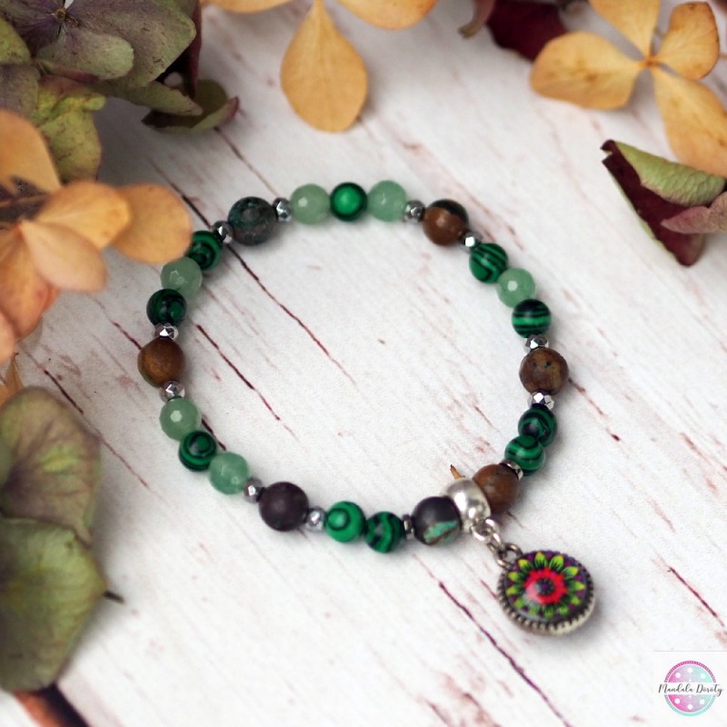 Bransoletka z mandalą "Teraz Jestem Sobą" w otoczeniu jaspisu 8 mm, malachitu 6 mm, awenturyn 6 mm. Rozmiar: na nadgarstek 16-17 cm. Możliwość dopasowania. Mandala (12 mm) jest obustronna.
