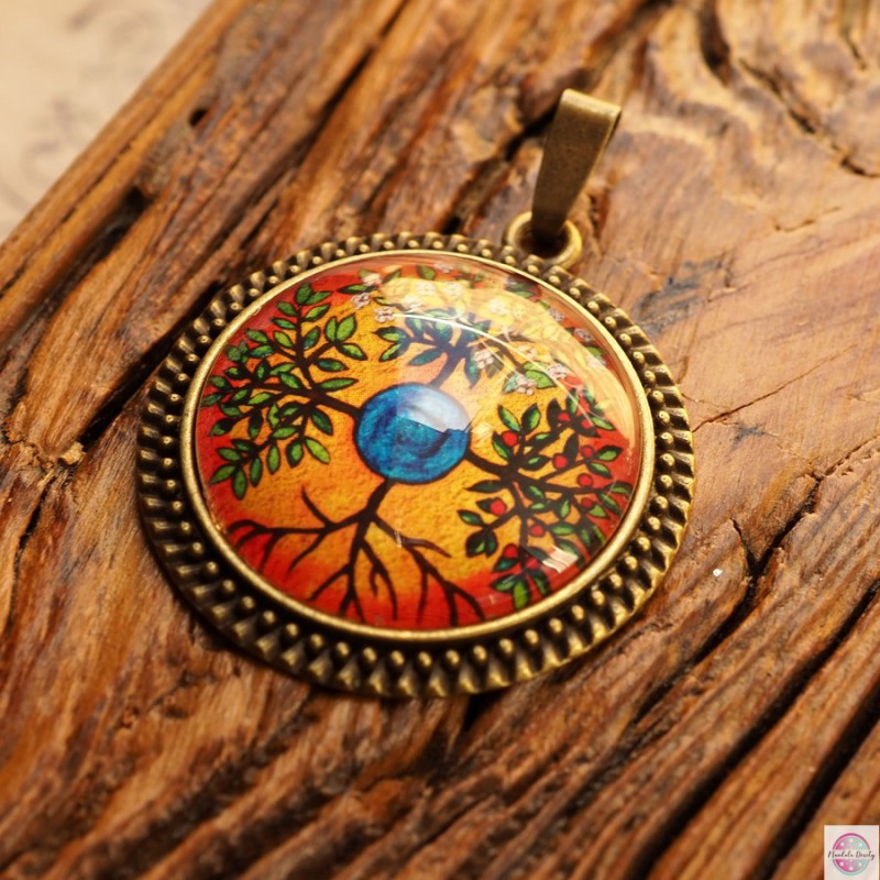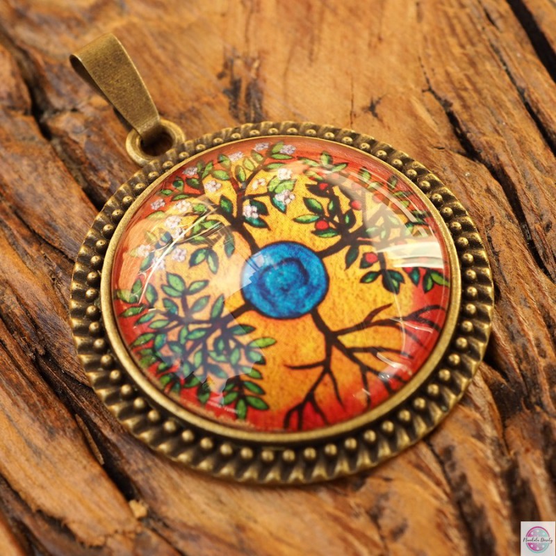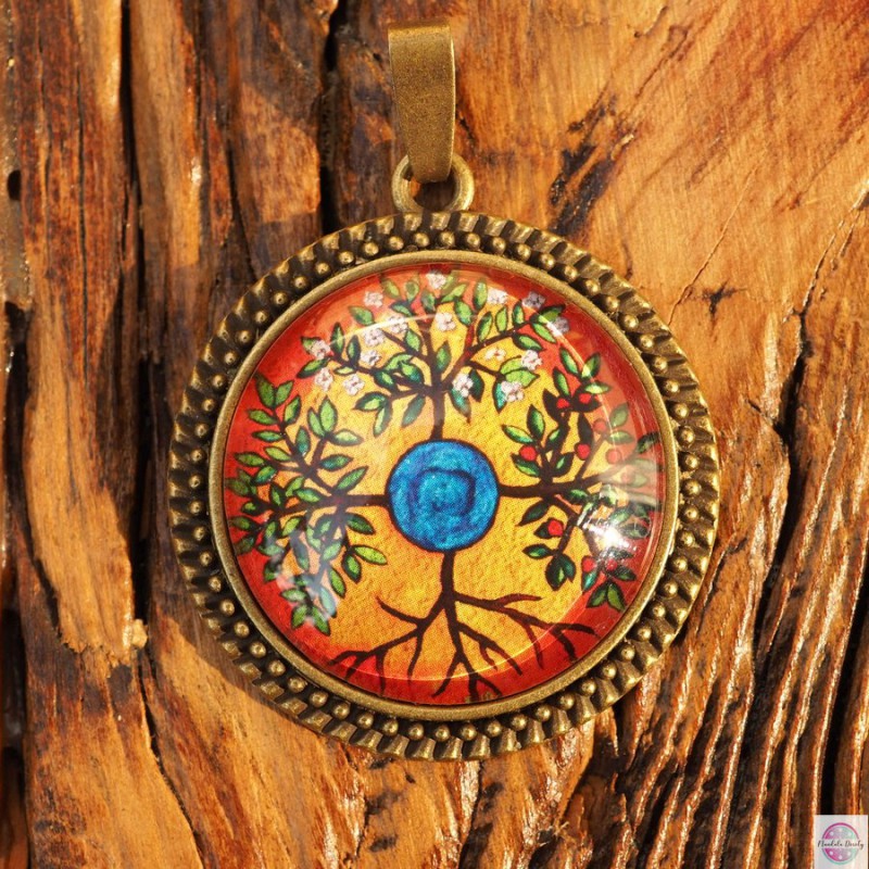 Medalion z mandalą “Cztery drzewa”. Mandala ta wprowadza równowagę, harmonię i porządek. Mandala ta poprzez cztery pory roku i zmienność zjawisk przyrody, paradoksalnie ukazuje bezczasowość Istnienia. Odzwierciedla procesy wewnętrznego uzdrawiania i stwarza od nowa poczucie bycia całkowitym i pełnym, ustanowione w tobie przez Jaźń. Ukazuje cykle życia w kosmicznym porządku świata.