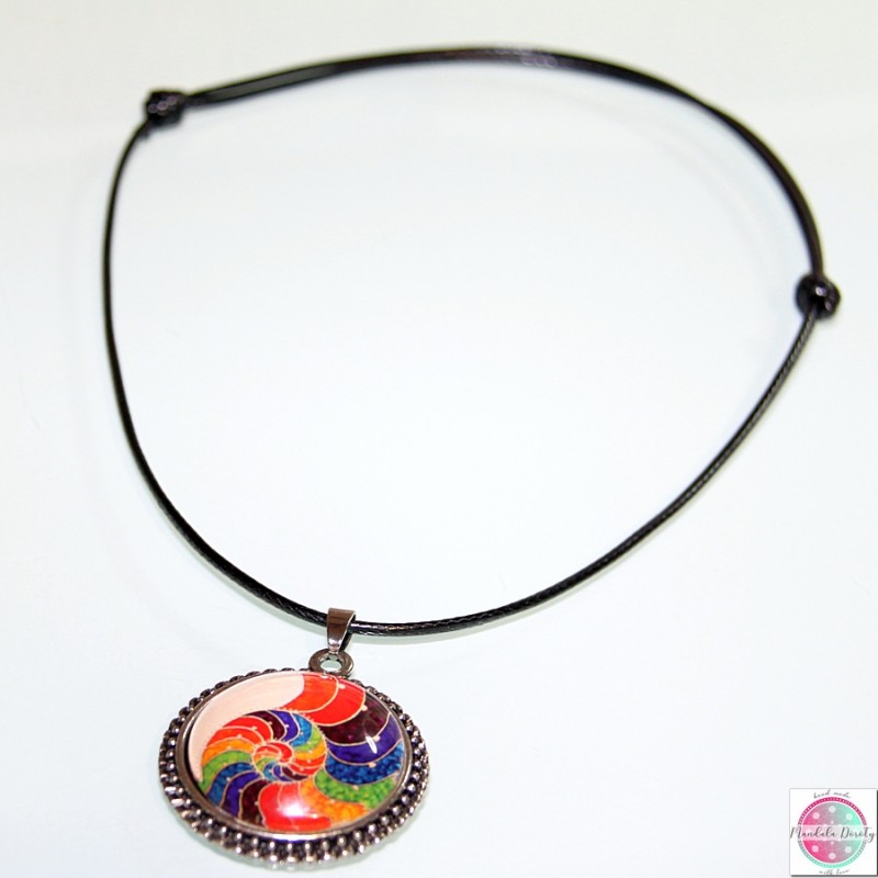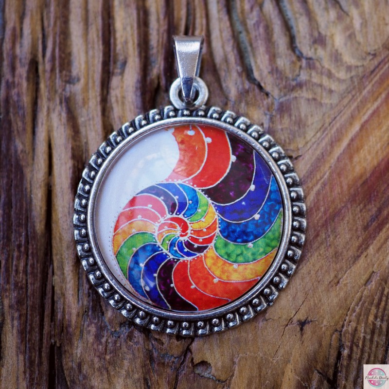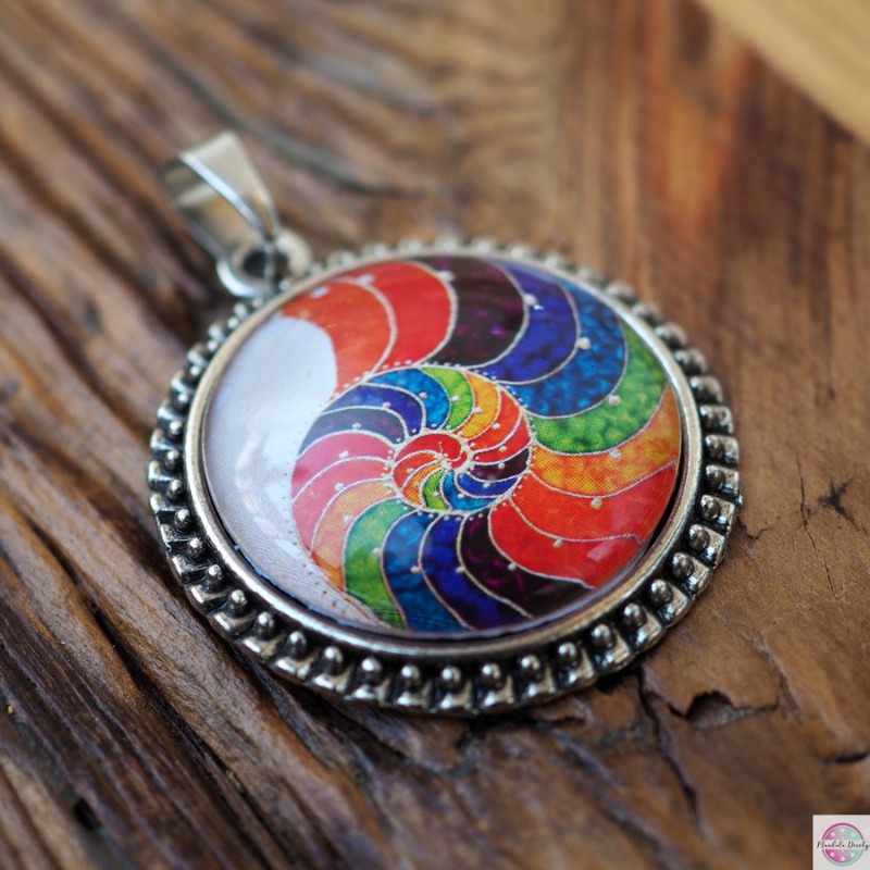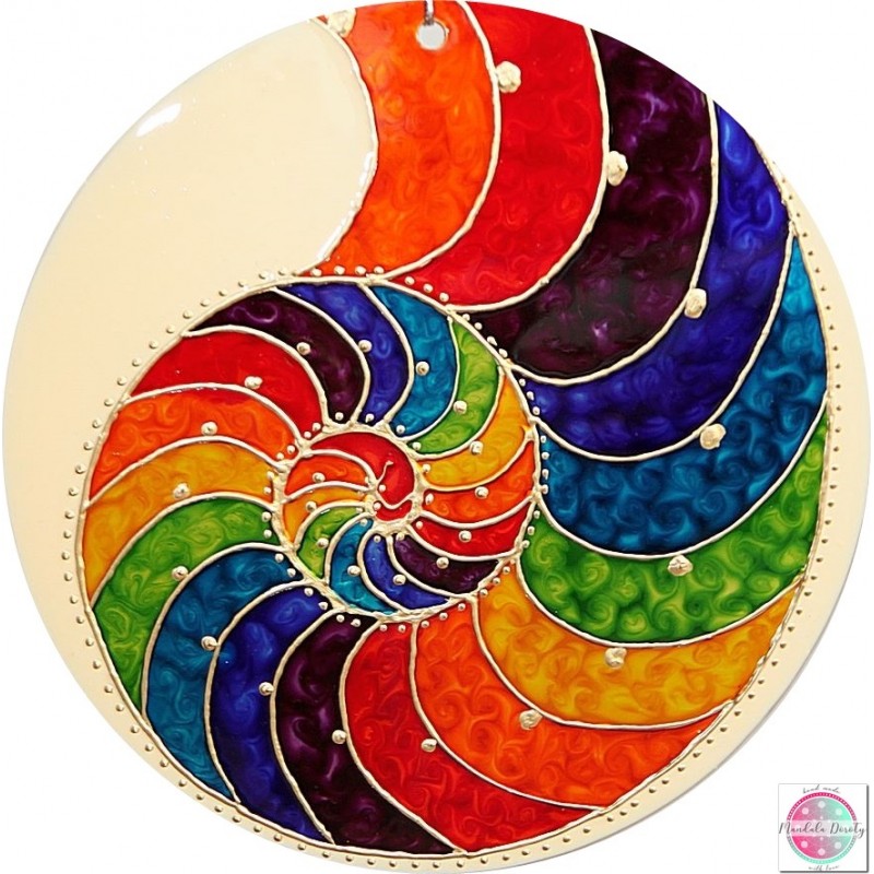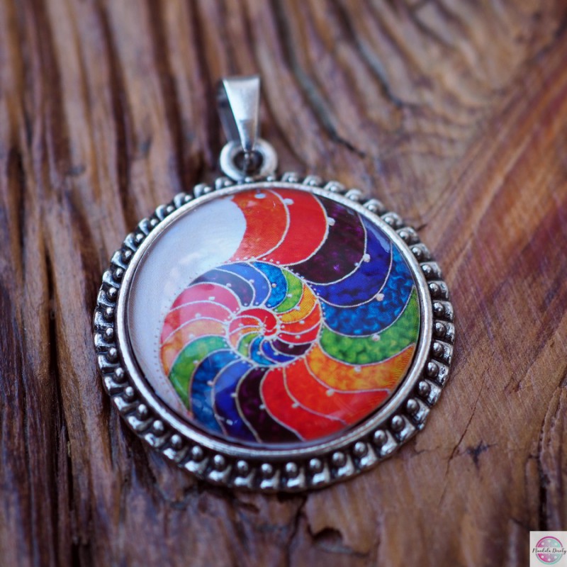 Medalion z mandalą "Spirala Złotego Podziału". Spirala złotego podziału - złoty podział to inaczej podział harmoniczny, złota proporcja, boska proporcja. Obecna jest wokół nas w przyrodzie, w ciele człowieka, w sztuce. Oddziałuje na naszą podświadomość i wprowadza harmonię i porządek. Kolory mandali to kolory tęczy, naszych czakr, dodatkowo oddziałują na nasze pole życiowe i DNA.