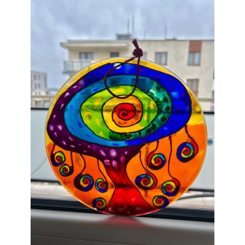 Oryginalna mandala namalowana ręcznie na szkle o średnicy 20 cm, farbami witrażowymi.