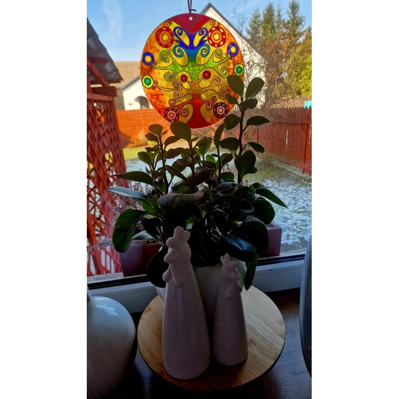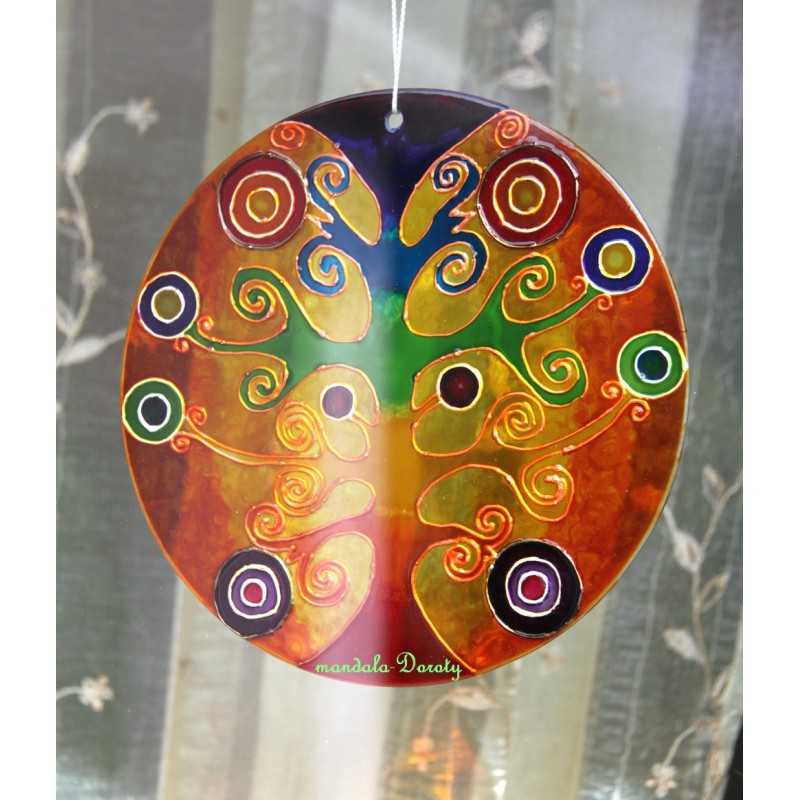 Mandala na szkle „Drzewo – Przepływ Życia” powstała by wspierać w harmonijnym wzroście, umożliwiać swobodny przepływ energii życia oraz uwolnić jednostkę od punktu widzenia ograniczonego czasem i przestrzenią, aby mogła dotknąć tego, co wieczne w niej samej. Mandala ta promieniuje radością, energią i życiem. Oryginalna mandala namalowana ręcznie na szkle o średnicy 21 cm. Copywright©