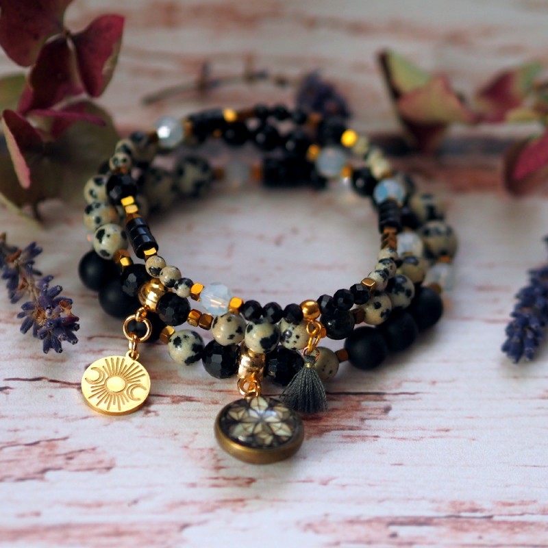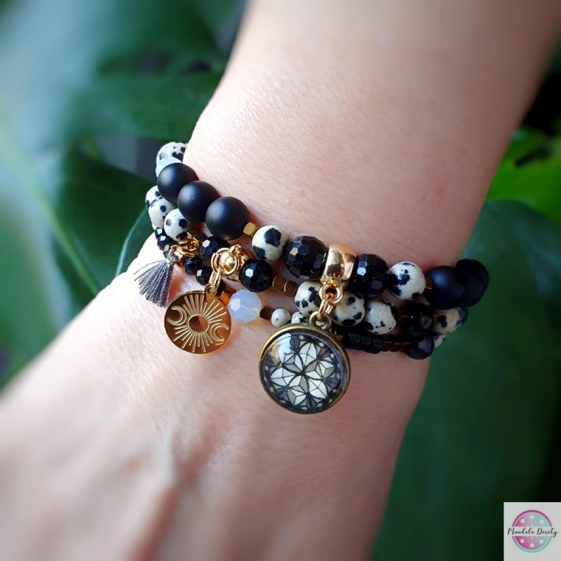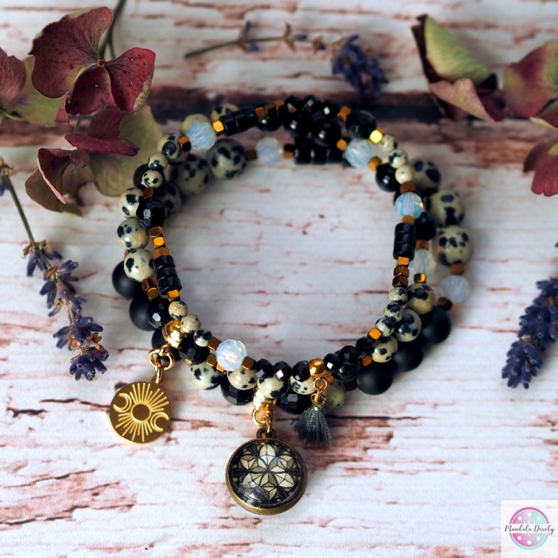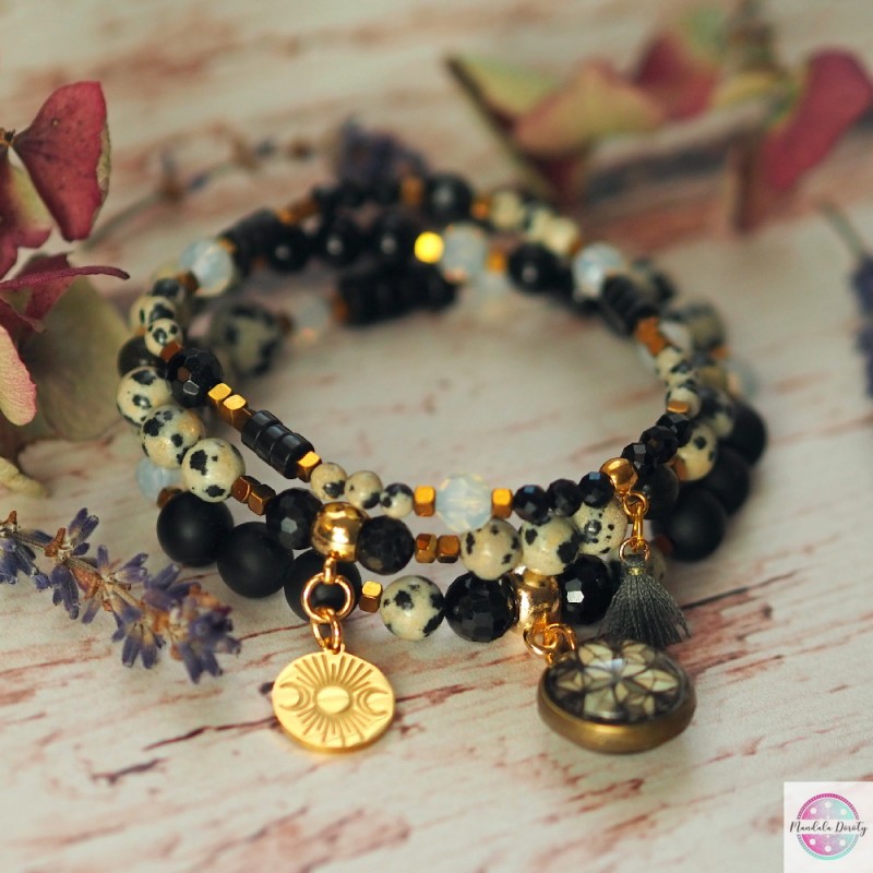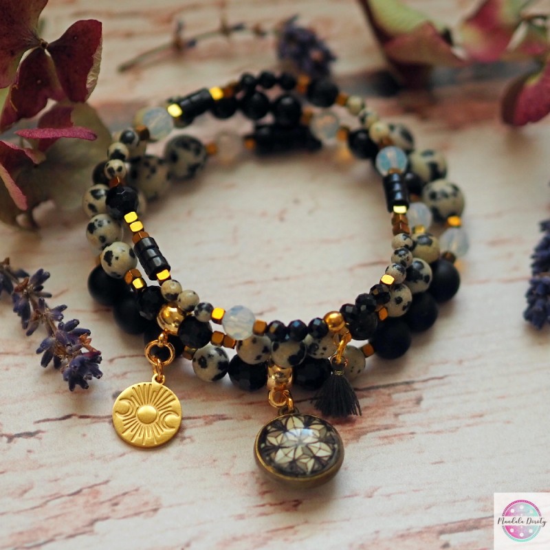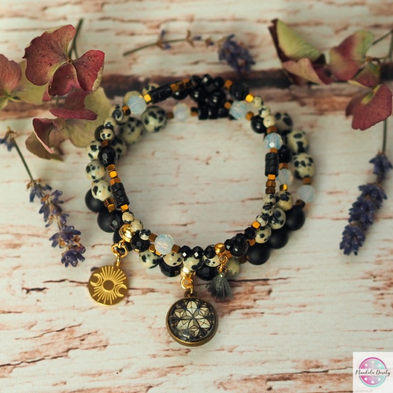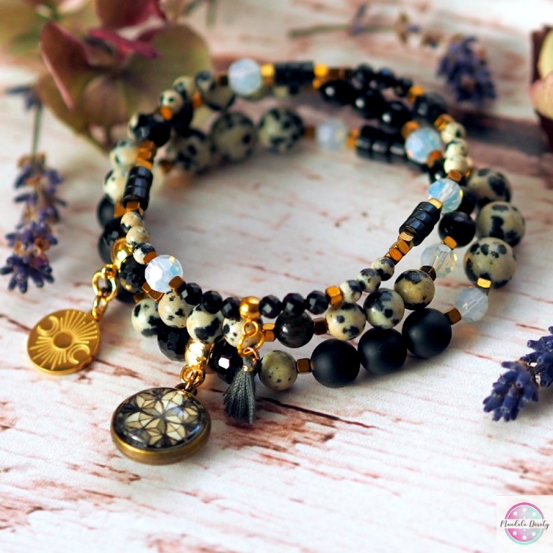Zestaw trzech bransoletek z mandalą "Kryształowa Tarcza" black w otoczeniu kamieni turmalinu, onyksu, obsydianu, jaspisu dalmatyńskiego, opalitu oraz złotych hematytów. Do zestawu dodałam zawieszkę ze stali szlachetnej oraz chwost.