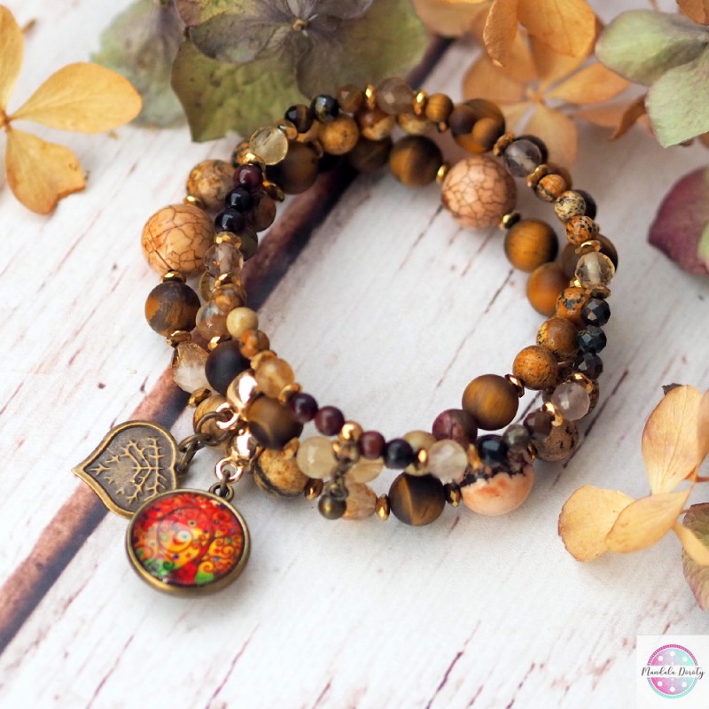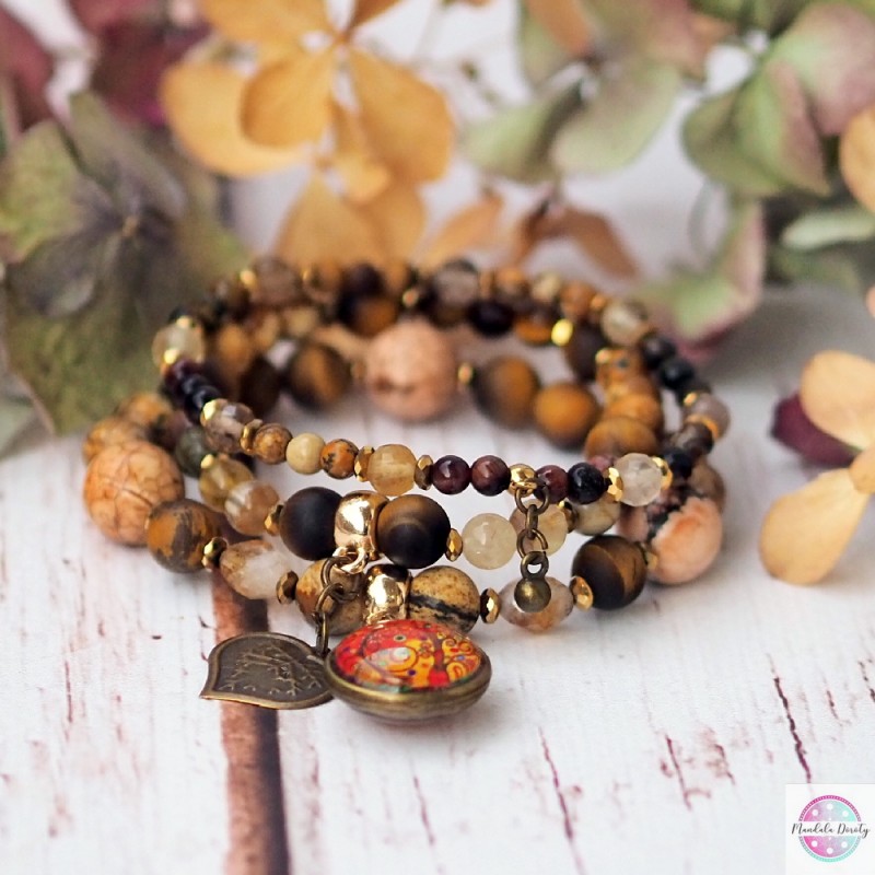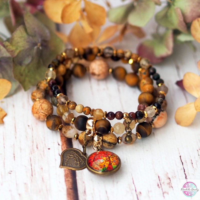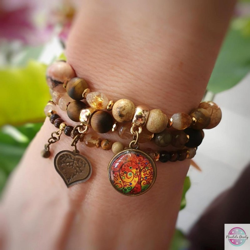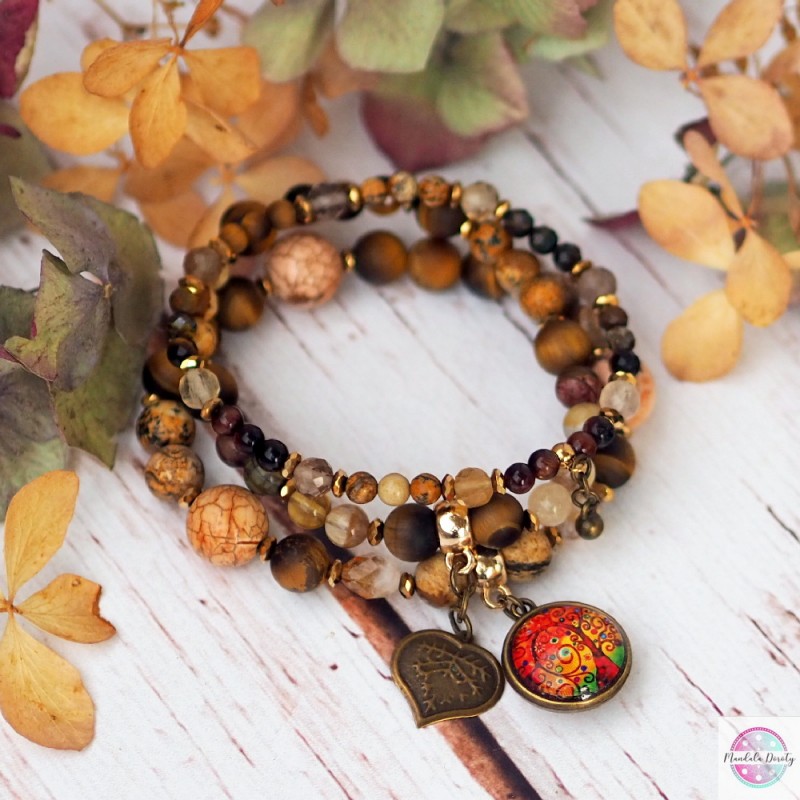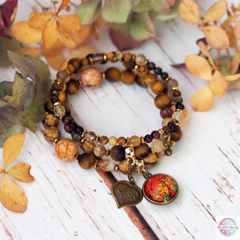Komplet trzech bransoletek z mandalą "Drzewo Wdzięczności" z zawieszkami serduszko i kulka. Użyte kamienie: jaspis, tygrysie oko, cytryn, fluoryt, bawole oko i hematyty. Piękny brązowo-złoty odcień. Możesz nosić razem lub osobno :).