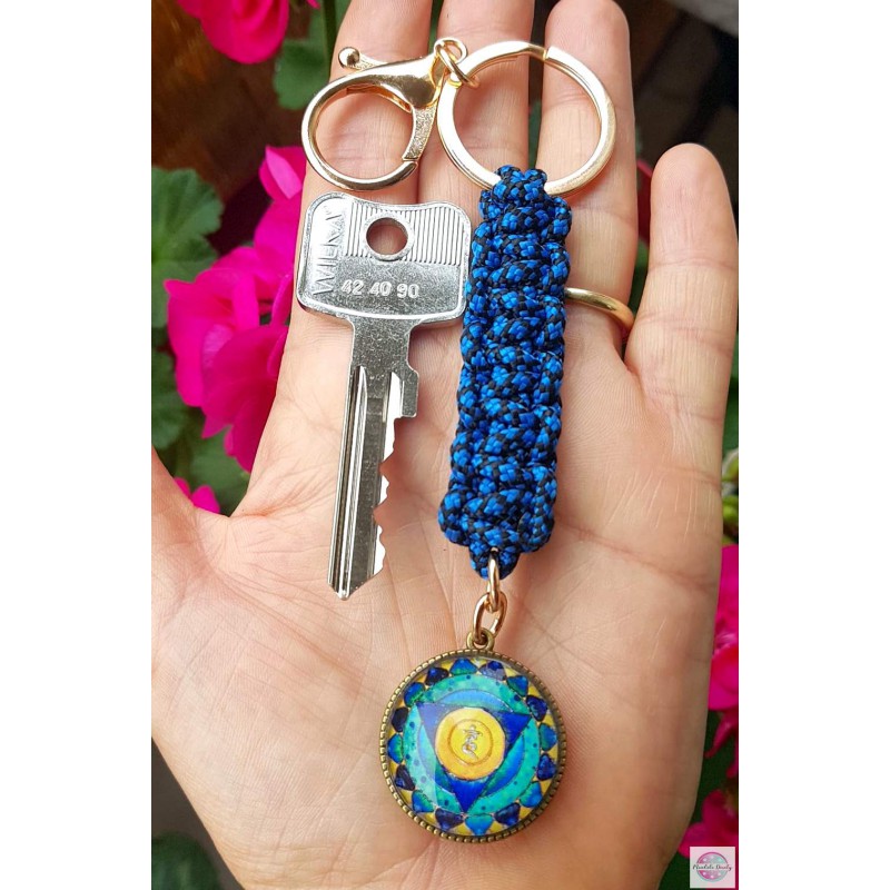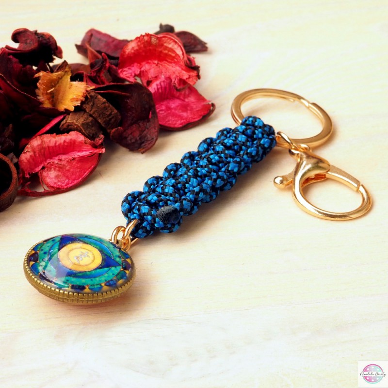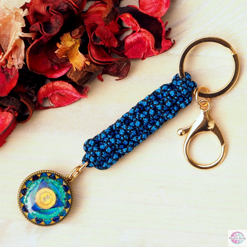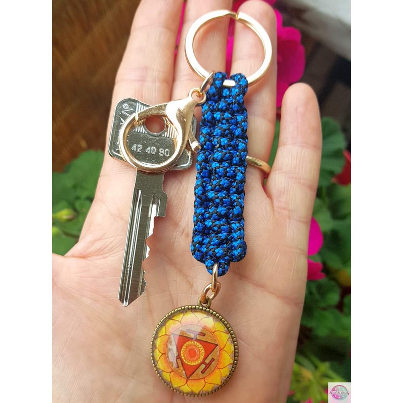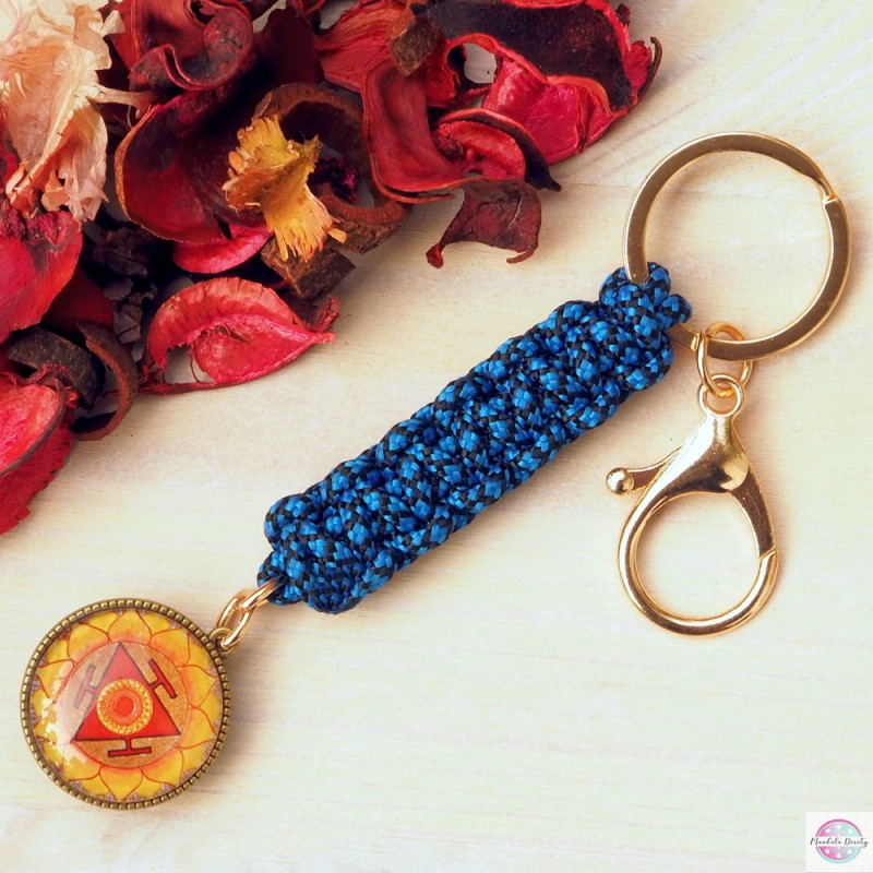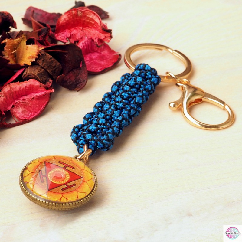 Duży i mocny brelok do kluczy z linki paracord z mandalą "Czakra trzecia - Splotu Słonecznego" i "Czakra piąta - Gardła" (25 mm) po obu stronach bazy.