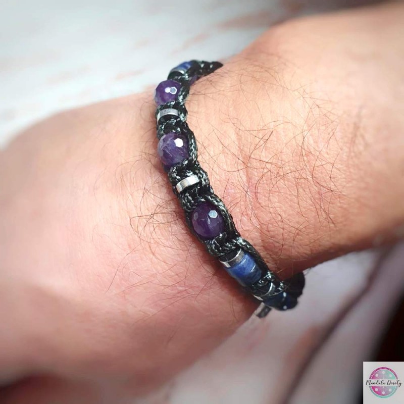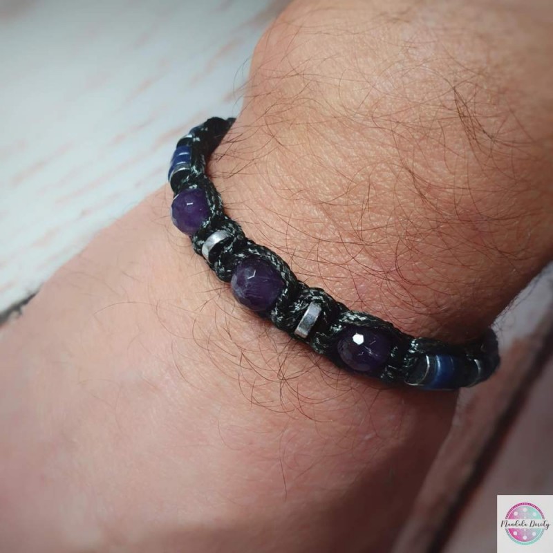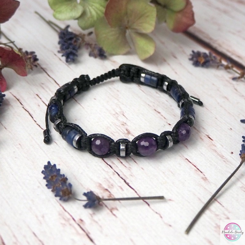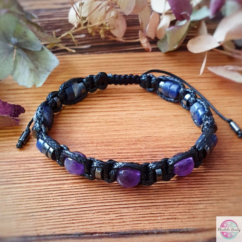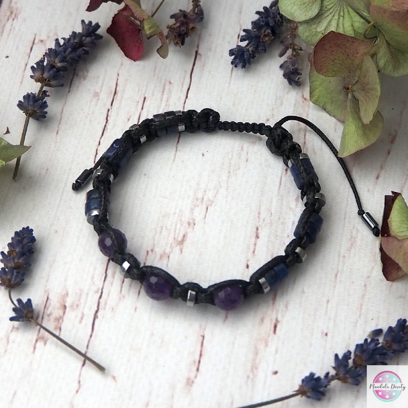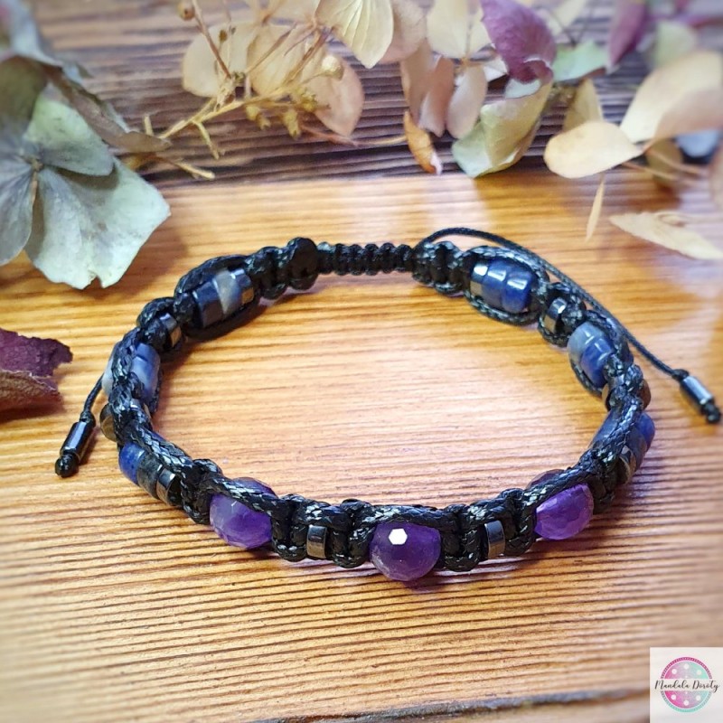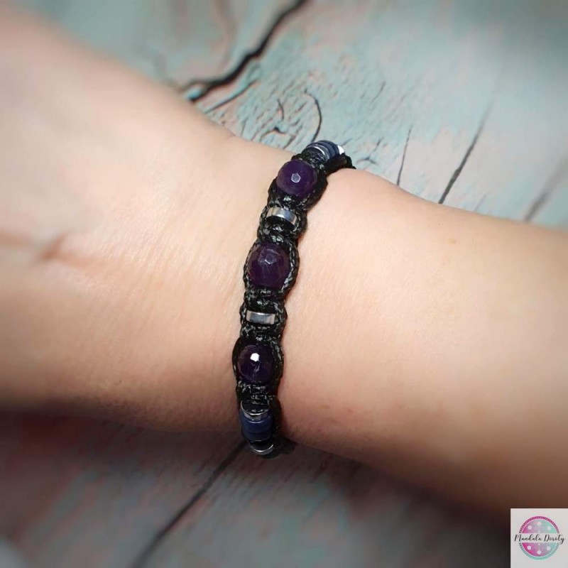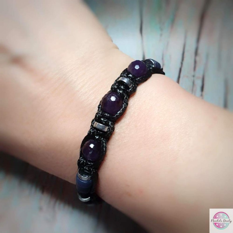 Bransoletka mineralna ręcznie pleciona z trzema fasetowanymi kulkami ametystu oraz krążkami dumortierytu. Przekładki z hematytów.