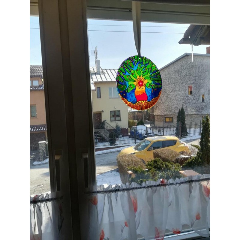 Namalowana na szkle o średnicy 20 cm, farbami witrażowymi. Do mandali dodaję przyssawkę.