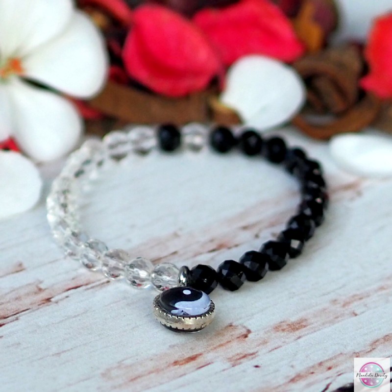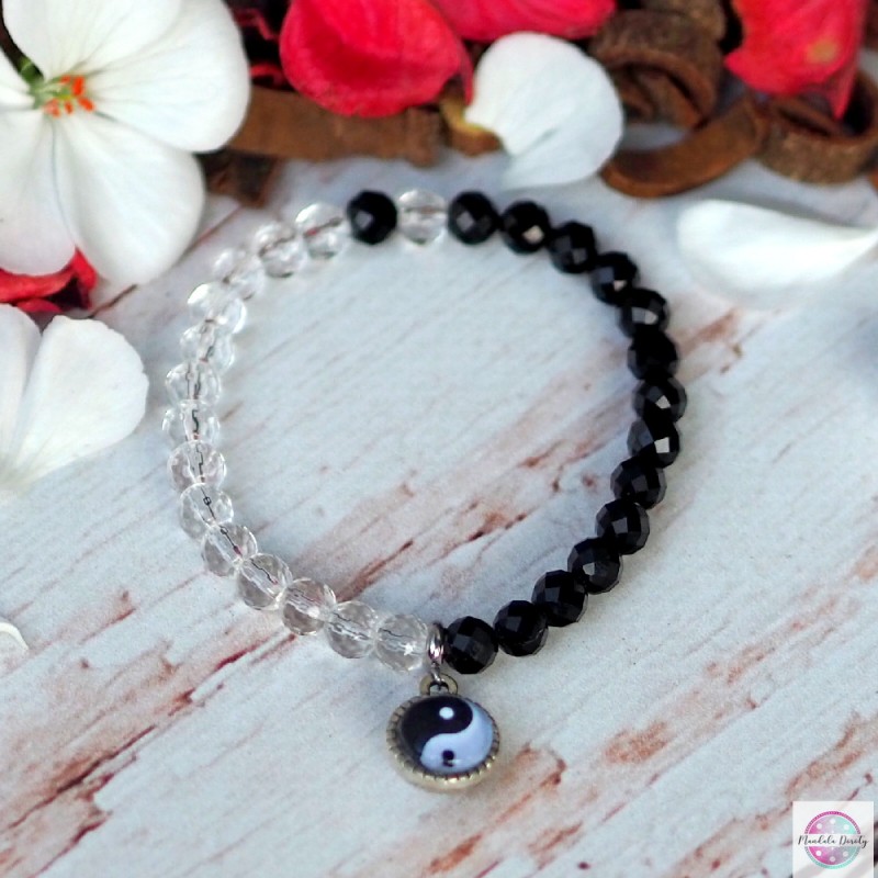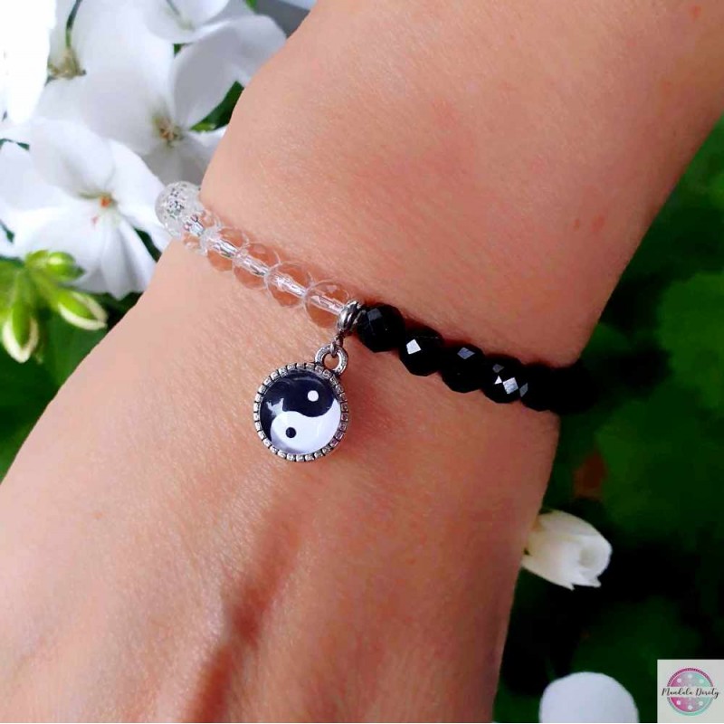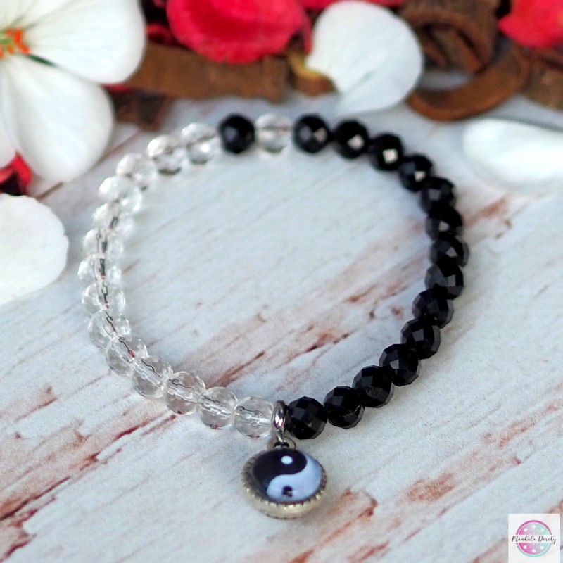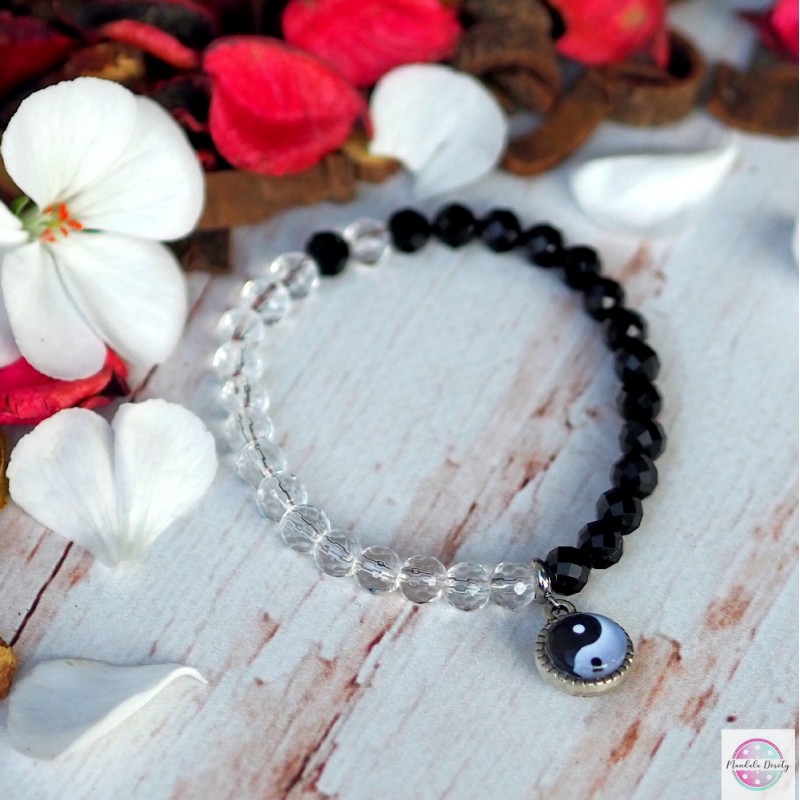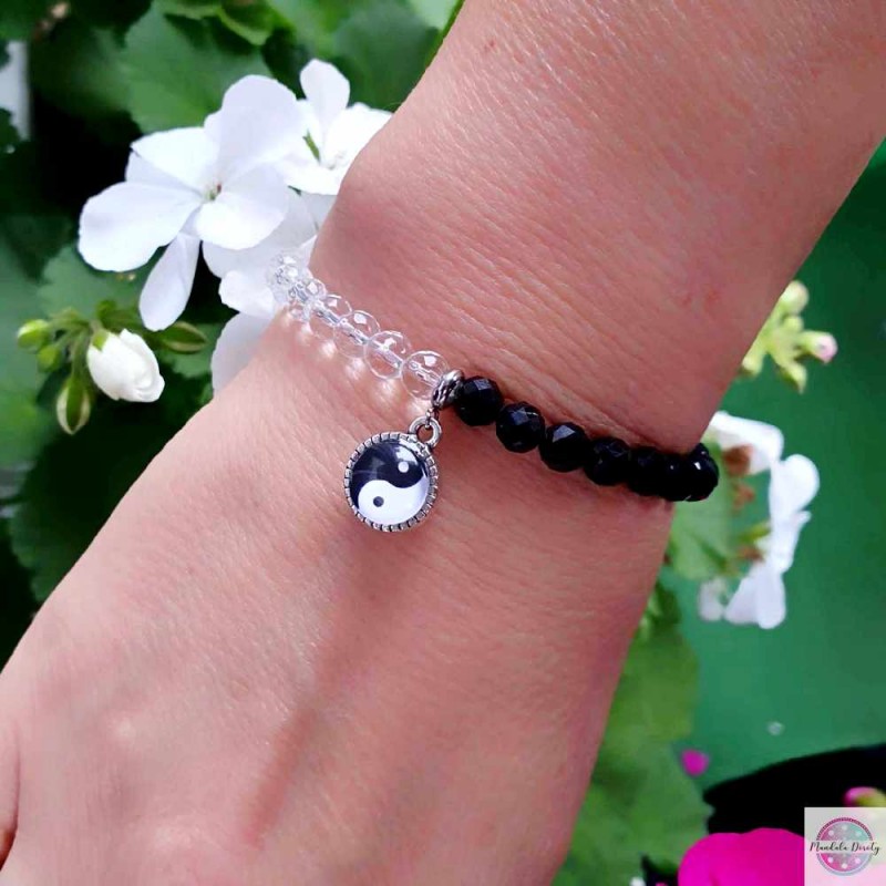 Klasyczna bransoletka na gumce z symbolem Yin Yang. W otoczeniu kamieni czarnego turmalinu oraz kryształu górskiego 6 mm. Mandala (10 mm) jest widoczna po obu stronach bazy. Rozmiar na nadgarstek: 16-17 cm.