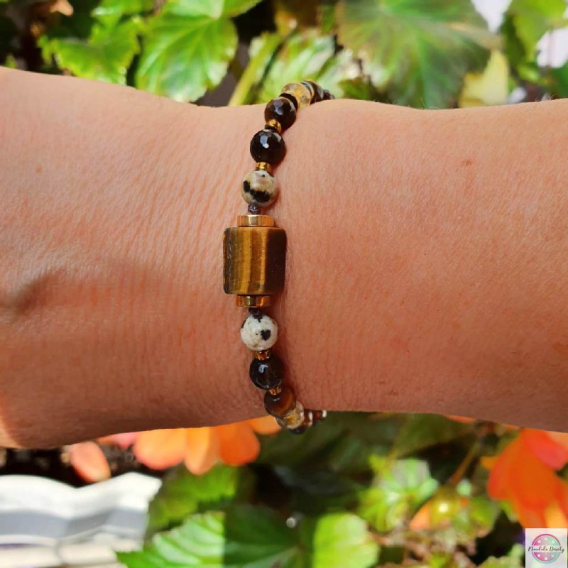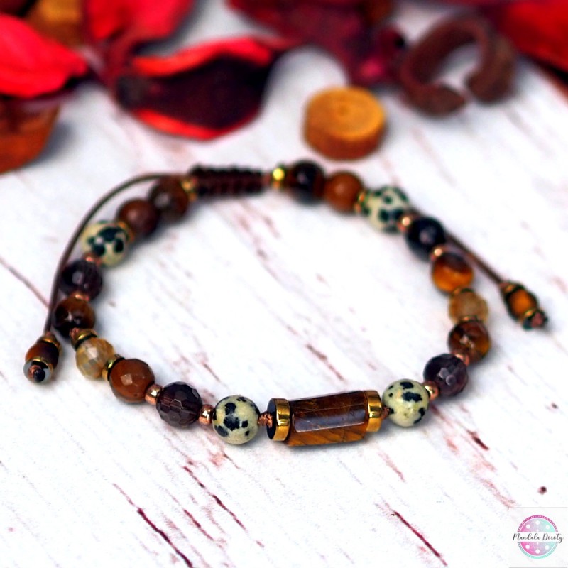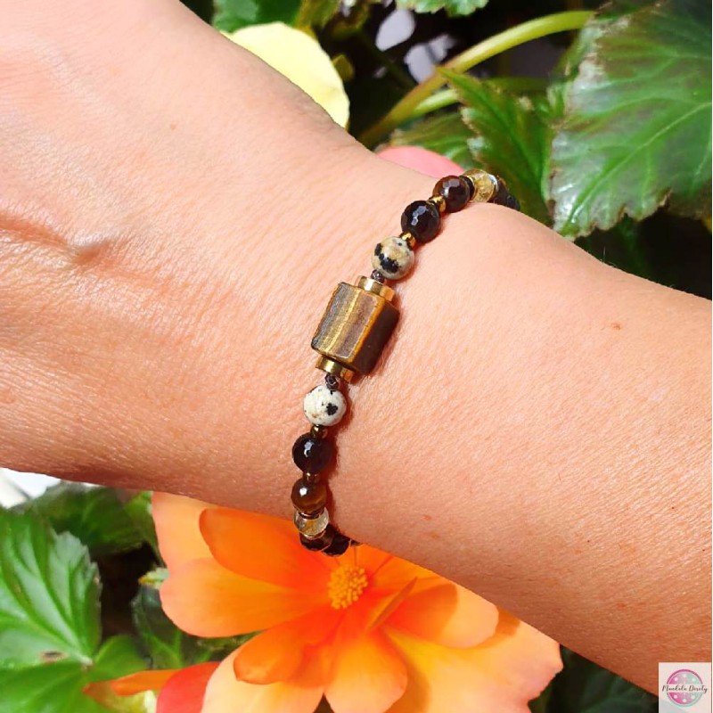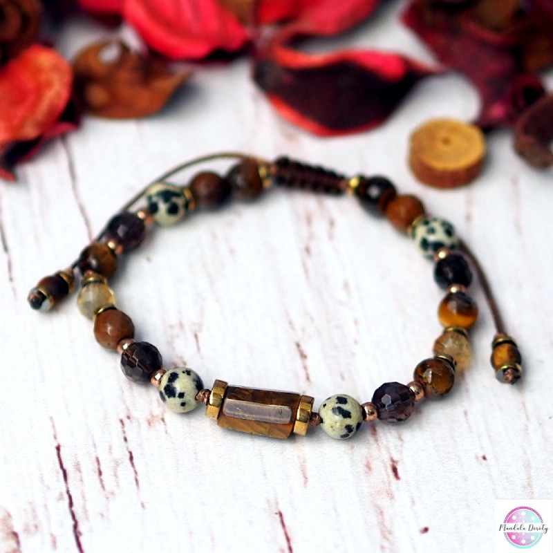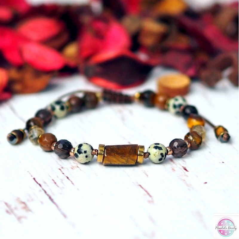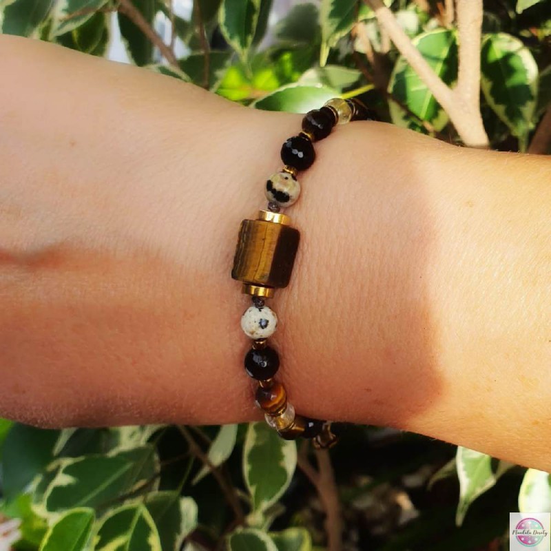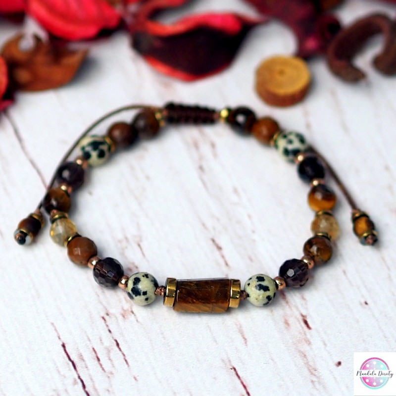 Bransoletka mineralna, która wspiera odwagę, intuicję i dobrobyt finansowy. Rozbudza naszą instynktowną naturę oraz chroni przed "złym okiem". Bransoletka z bryłką tygrysiego oka, z jaspisem dalmatyńskim, kwarcem dymny, i cytrynem.