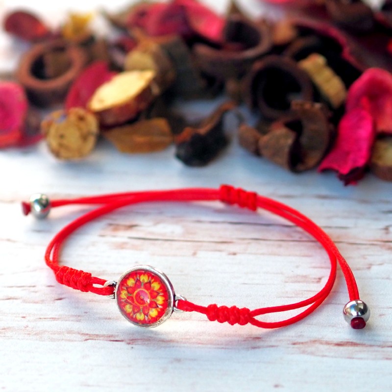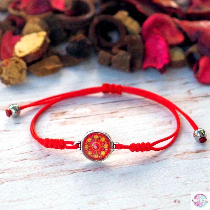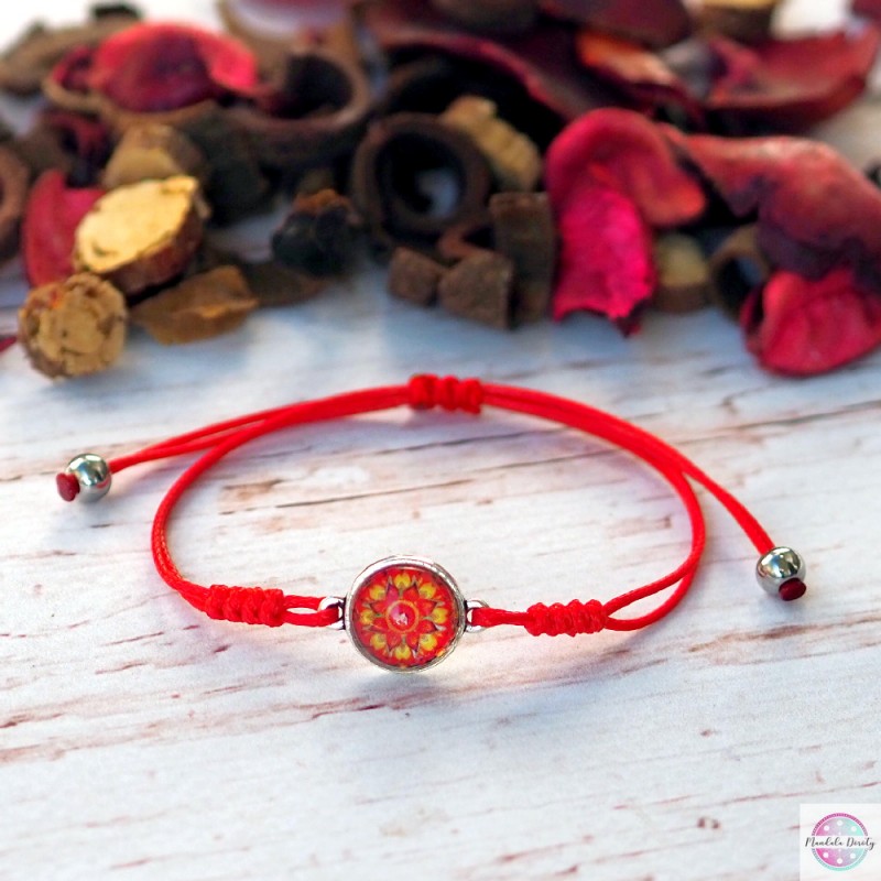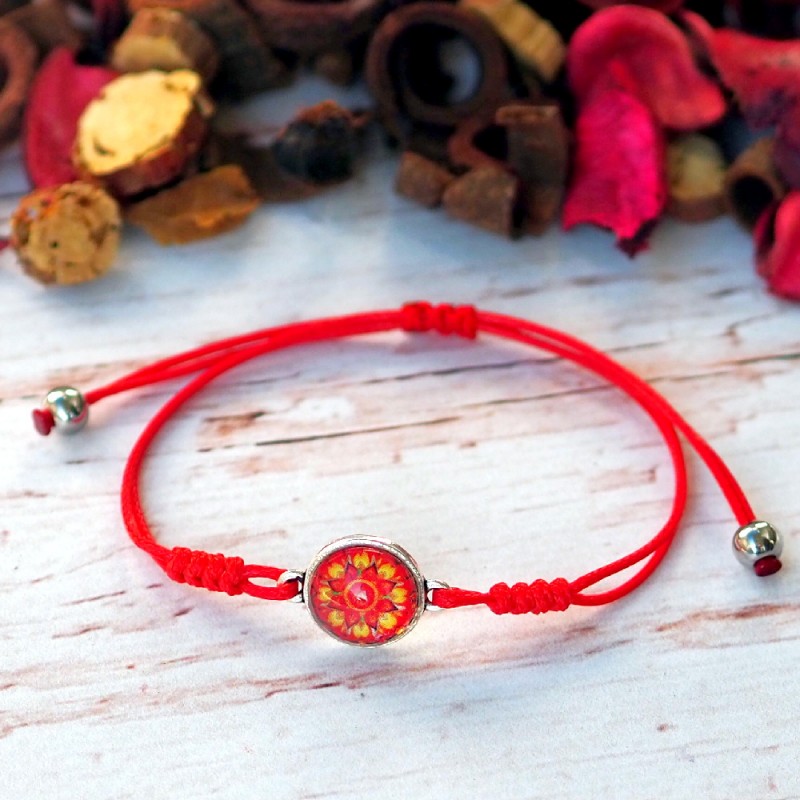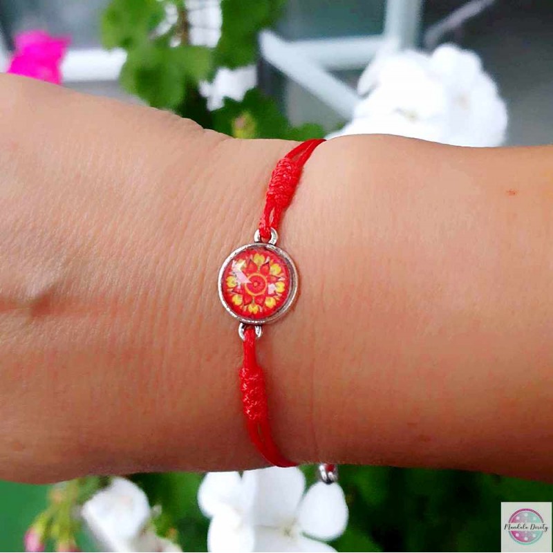 Delikatna i kobieca bransoletka z mandalą "Odwaga". Mandala na szkle "Odwaga" powstała w intencji obudzenia w nas energii, która stawia czoło lękowi i daje nam moc realizacji i osiągania ważnych dla nas celów mimo obaw czy ryzyka.