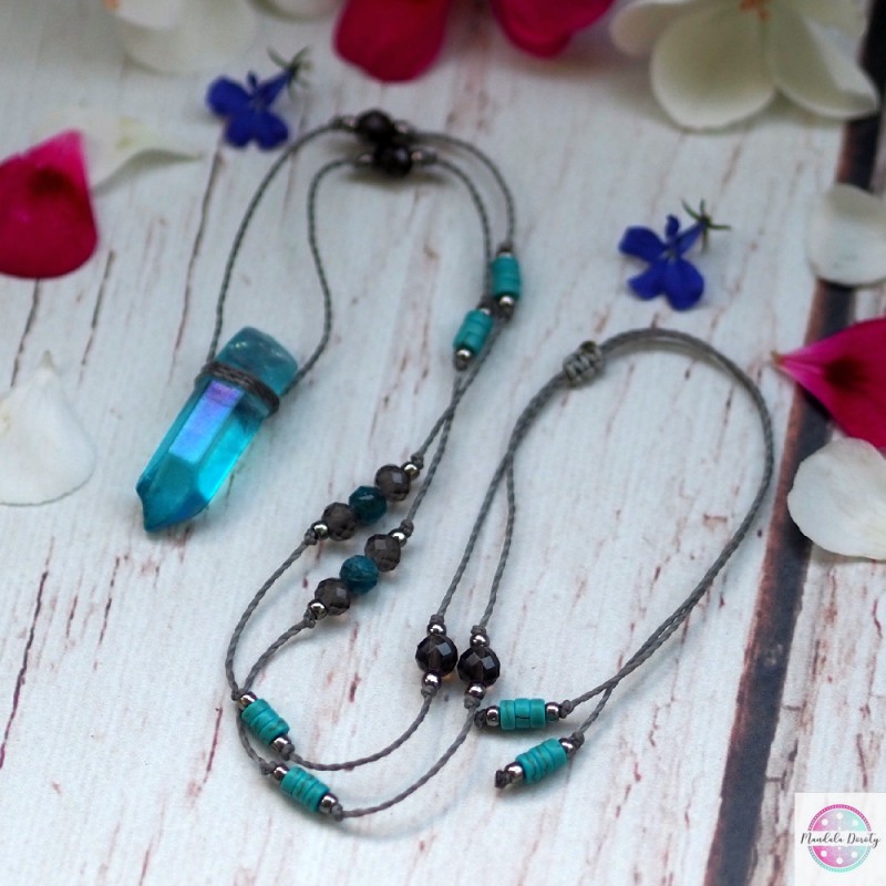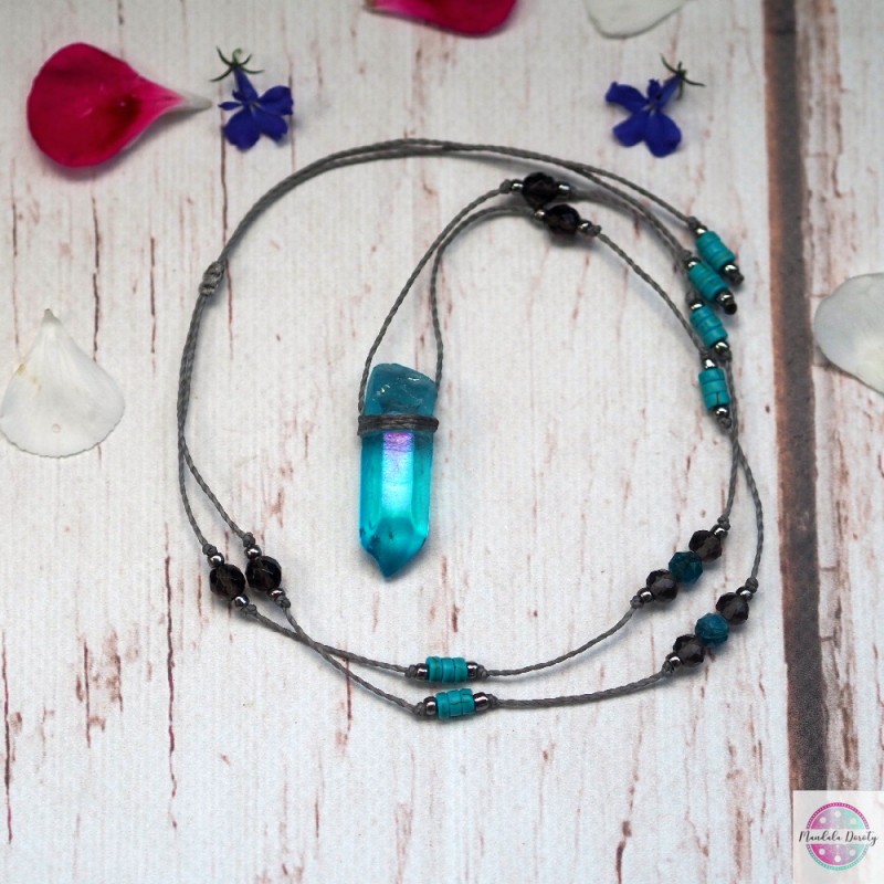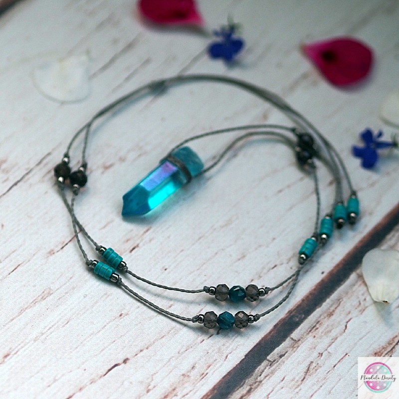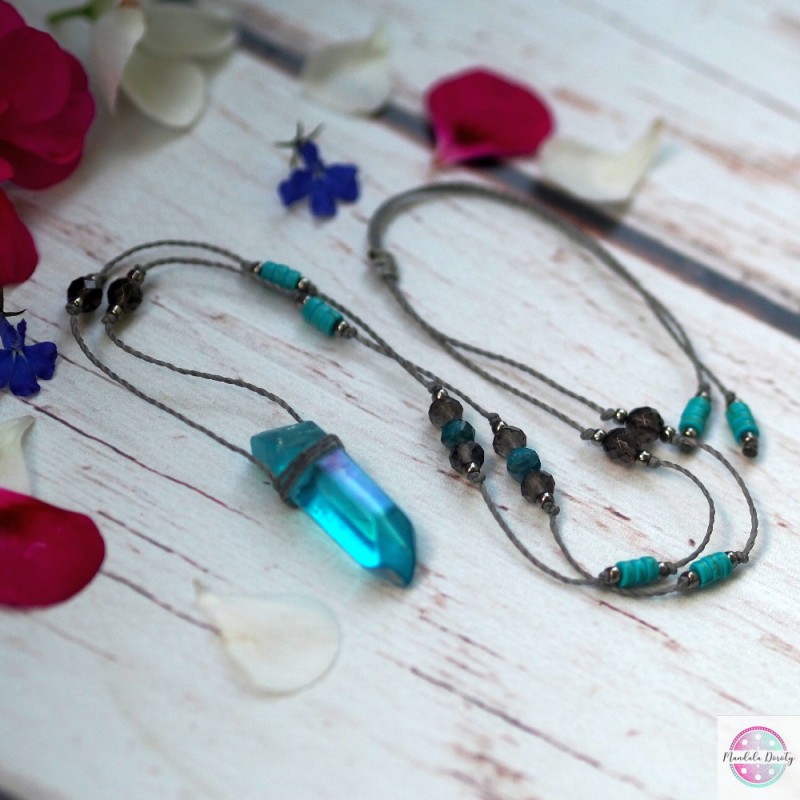 Naszyjnik z kwarcem aqua aurą. Na szarym skręcanym sznurku. Dodałam do niego kamienie kwarcu dymnego, niebieskiego apatytu oraz turksowego howlitu. Przekładki z koralików. Do codziennego noszenia i odnawiania energii. Wielkość kwarcu ok. 40 mm. Długość regulowana, maksymalna długość: ok. 45 cm. Można nosić krótko przy szyi lub dłużej na klatce piersiowej.