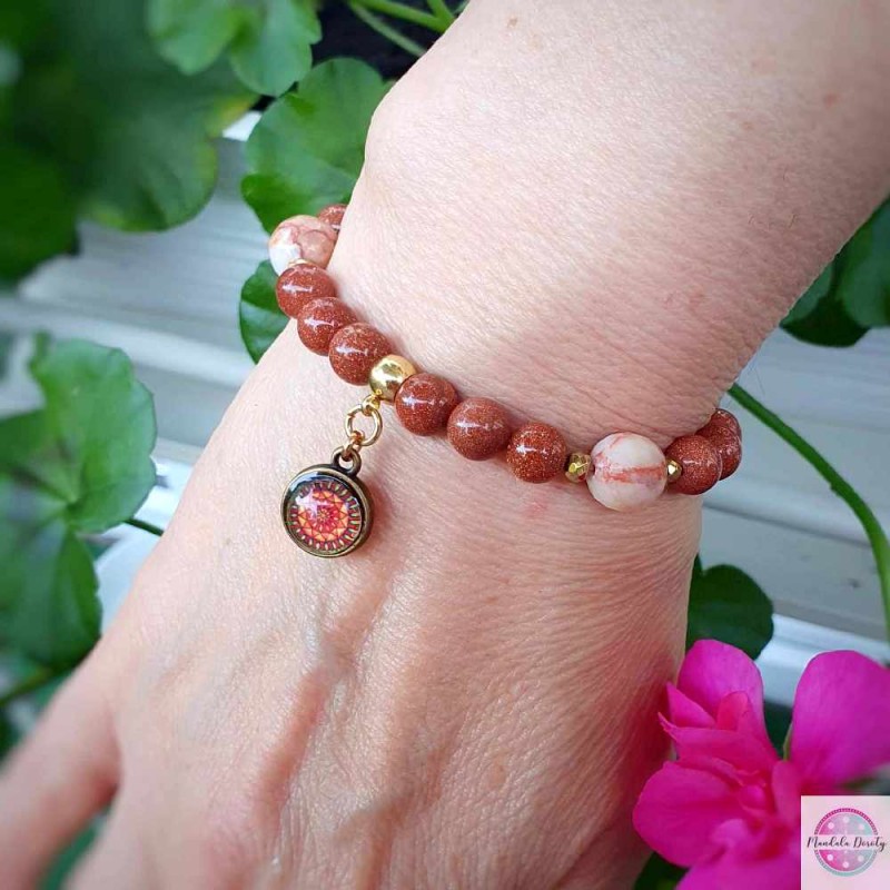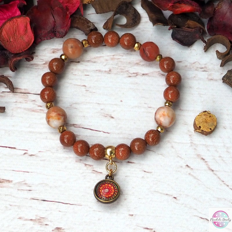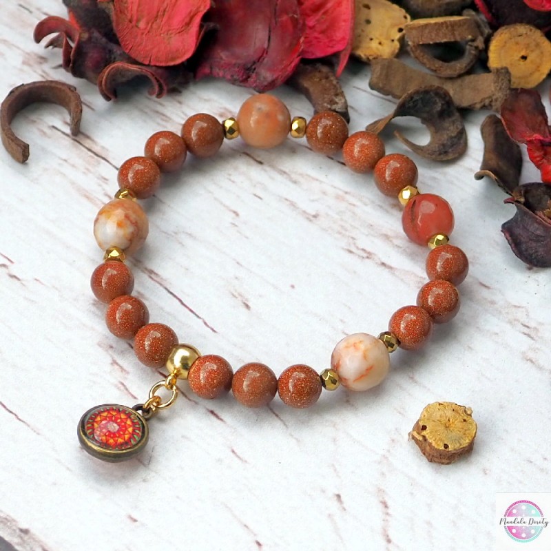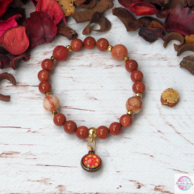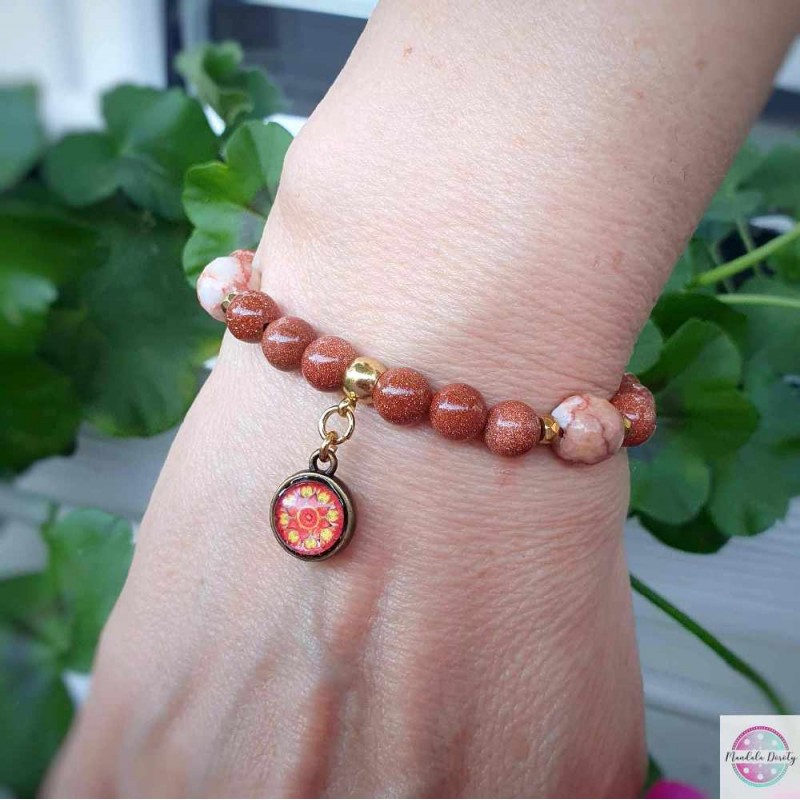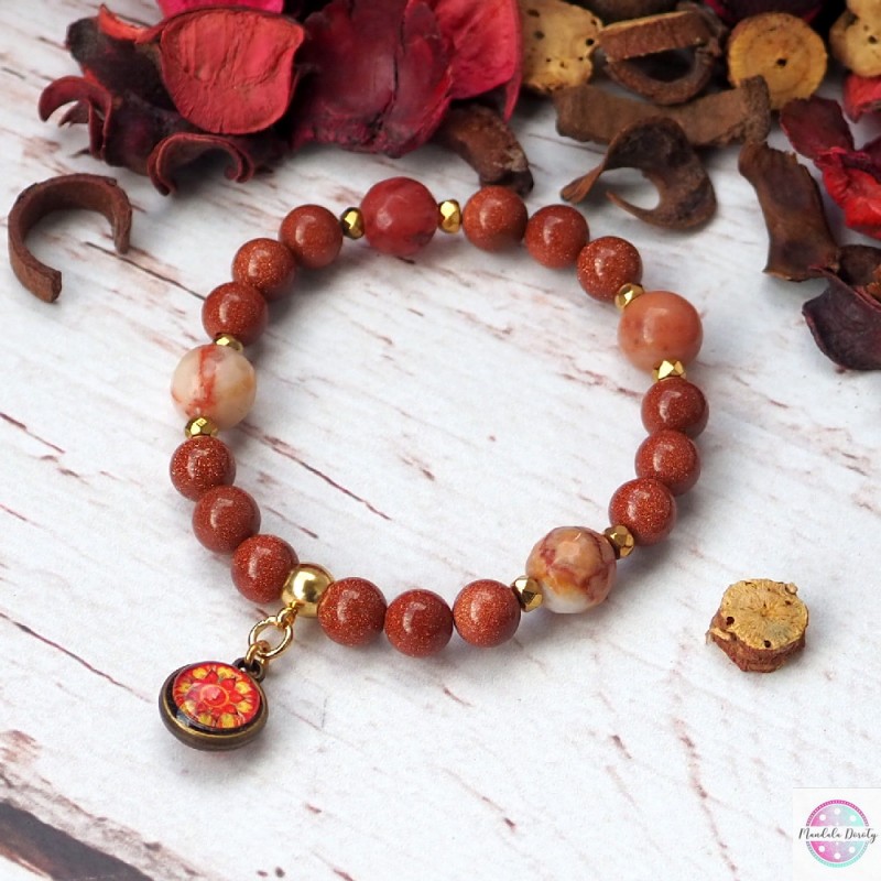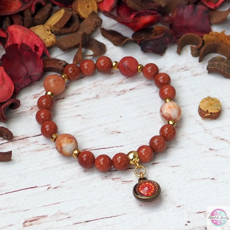 Energetyczna bransoletka z dwoma mandalami "Ognista" oraz "Odwaga" w otoczeniu kamieni piasku pustyni 8 mm i jaspisu z przekładkami z hematytu.