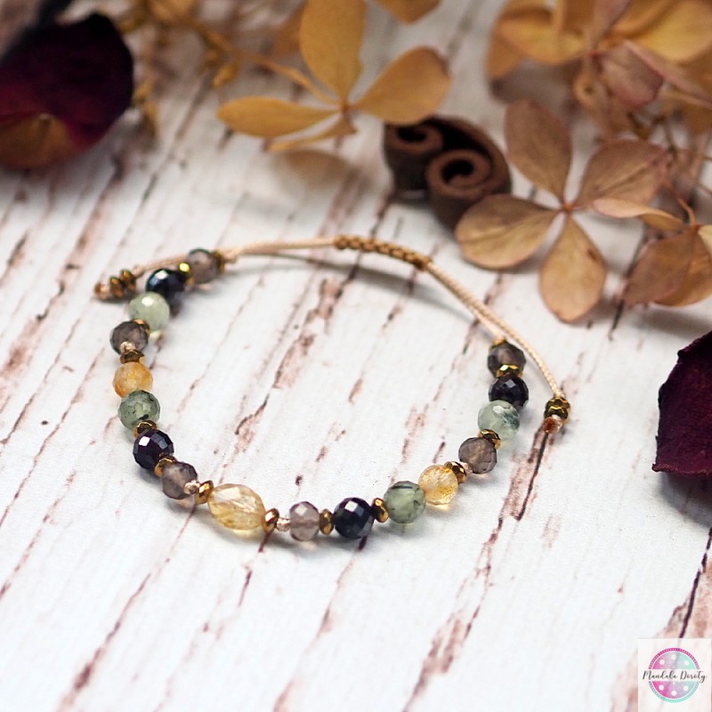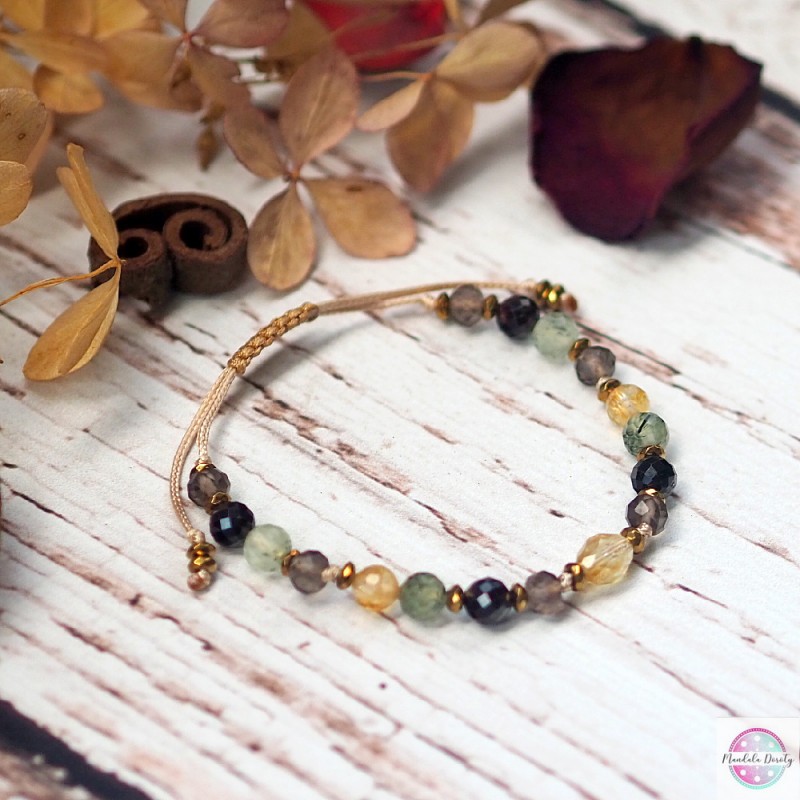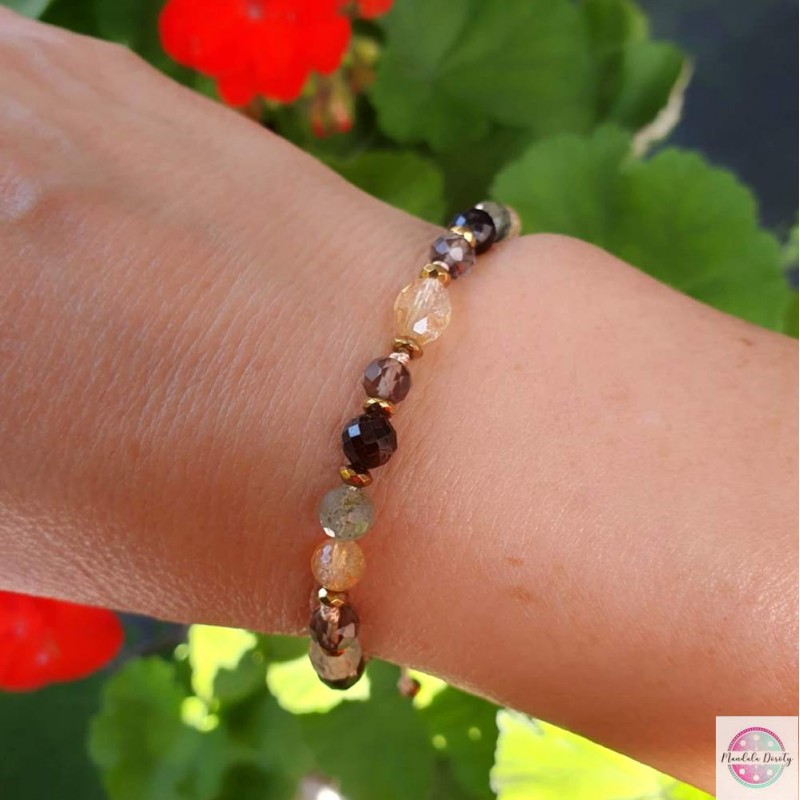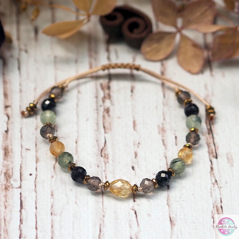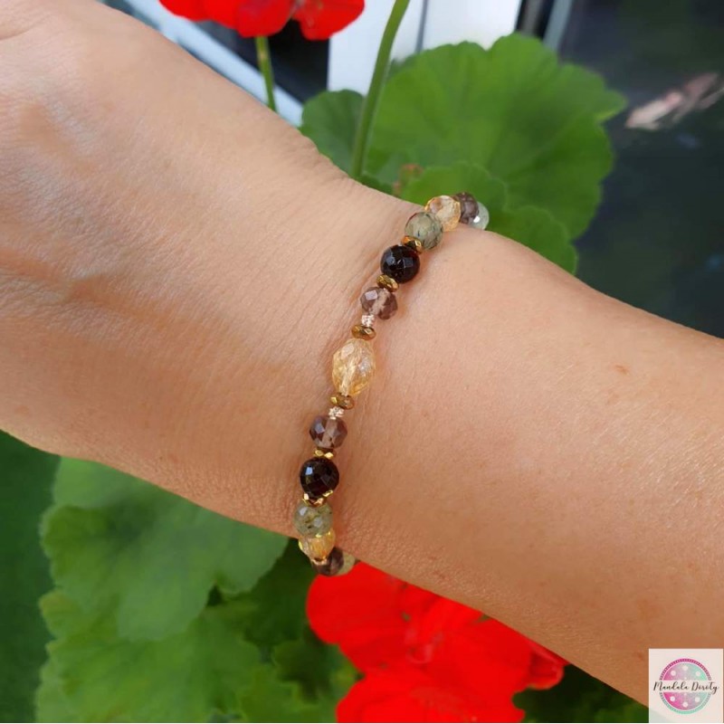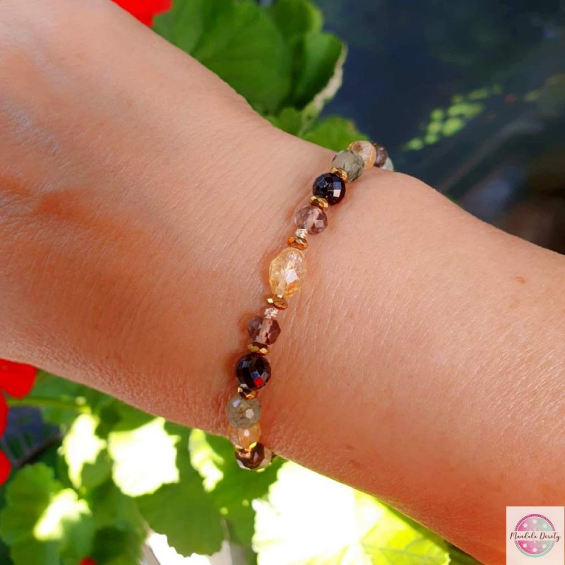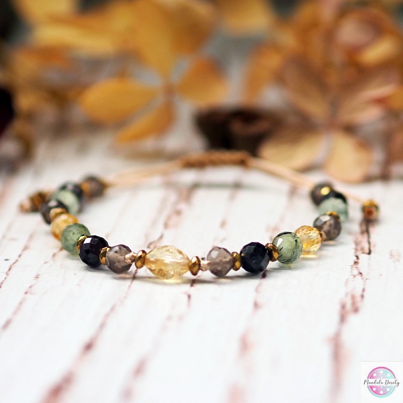 Bransoletka stworzona po to, aby pomóc Ci dostrzegać jasne strony życia, odbudować optymizm, wzmocnić równowagę emocjonalną. Odnaleźć RADOŚĆ i entuzjazm. Bransoletka ręcznie wykonana z bryłki naturalnego cytrynu oraz kamieni cytrynu, granatu, prehnitu i kwarcu dymnego. Przekładki ze złotych hematytów. Na beżowym sznurku, regulowana wielkość.